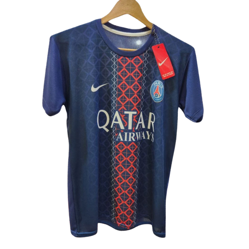کیت اول پاری سن ژرمن ۲۰۲۶ شامل تیشرت و شورت فوتبالی با پارچه سوپر فلامنت حصیری، چاپ کامل روی پارچه و دوخت بسیار تمیز، تولید ایران.