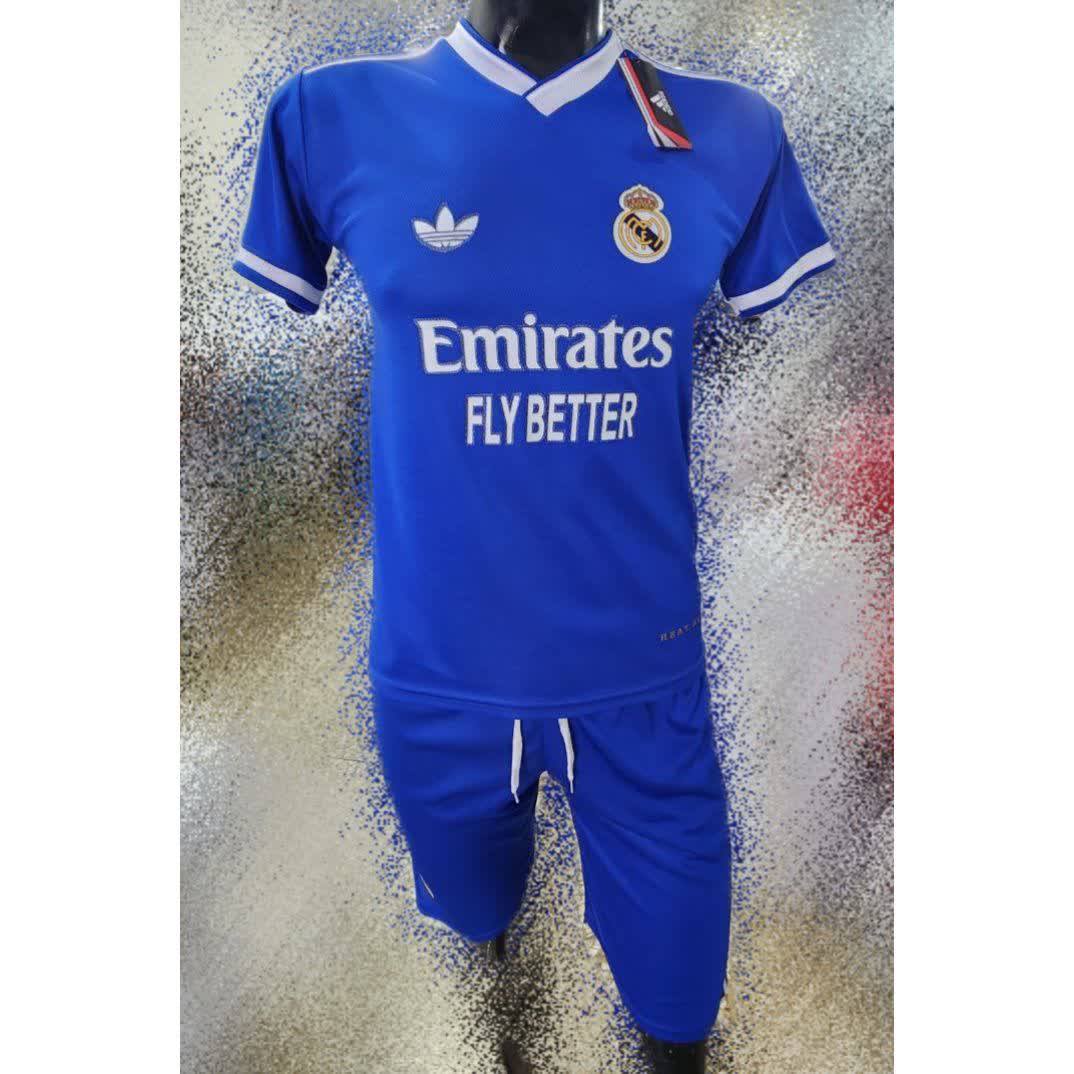 کیت سوم رئال مادرید 2026 | ست تی‌شرت و شورت با جنس سوپر فلامنت 💯، دوخت تمیز و لوگو برجسته — همراه با شماره 10 امباپه و شماره 7 وینیسیوس 🔵🇮🇷
