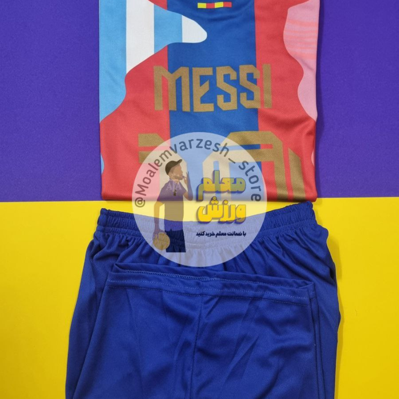 کیت فوتبالی لیونل مسی شماره ۱۰ شامل تیشرت و شورت ورزشی با دوخت تمیز و چاپ ماندگار، مناسب تمرین و مسابقه فوتبال، تولید ایران با کیفیت عالی.