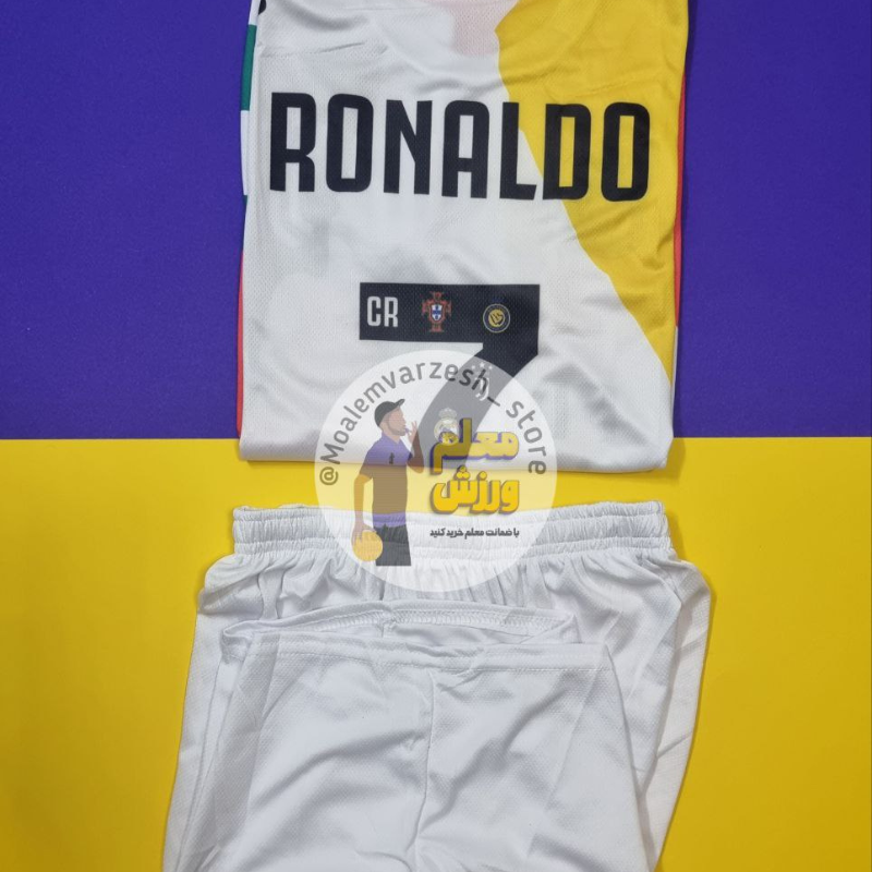 کیت فوتبالی رونالدو شماره ۷ شامل تیشرت و شورت ورزشی با دوخت تمیز و چاپ ماندگار، مناسب تمرین، مسابقه و استفاده روزمره. تولید ایران با کیفیت عالی.